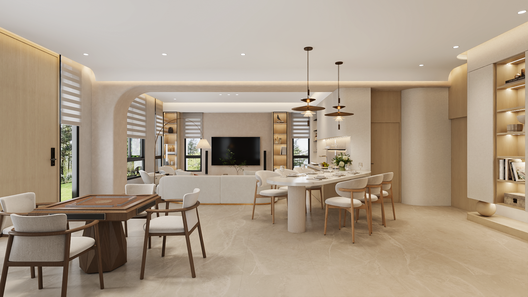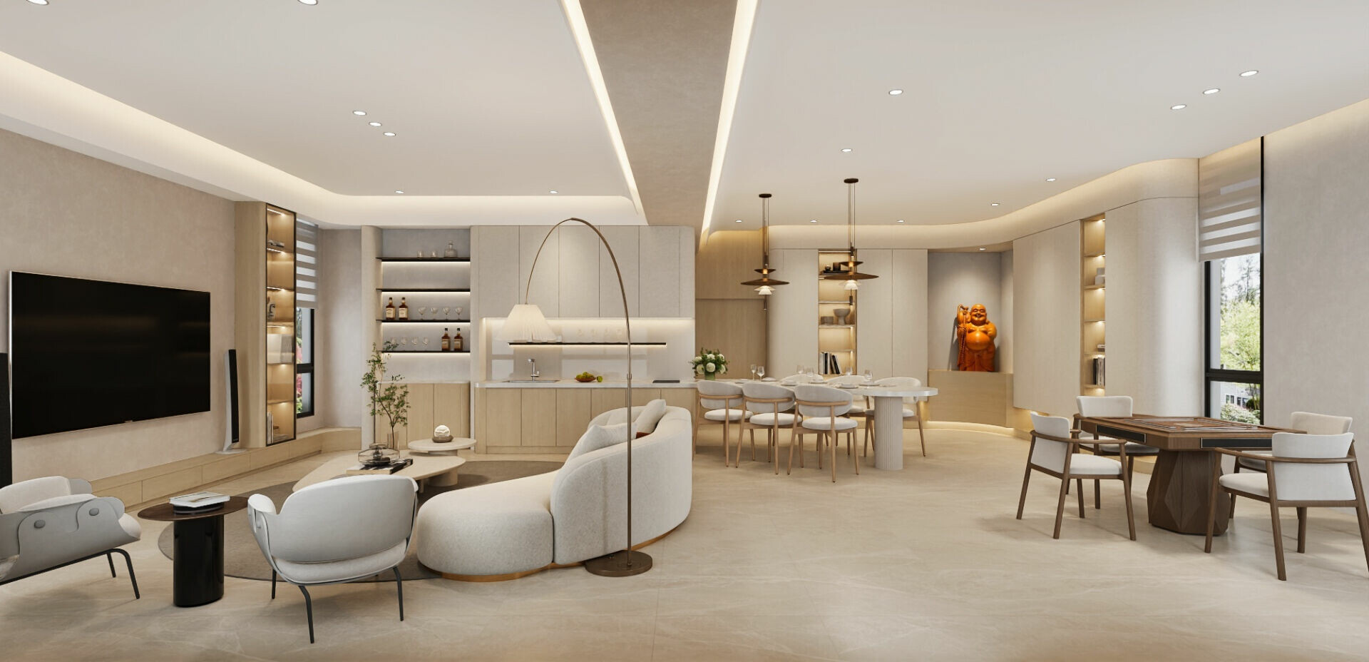 空間以「光」為靈魂,用自然光與間接照明構築生活的節奏。每一束光的變化,都是時間在說話,也讓居者重新感受生活的呼吸。主色以米白、淺木與霧灰為基調,搭配弧形牆面與輕柔材質,使整體氛圍如晨霧般平靜。弧線的動線消弭了空間的邊界,也消融了生活的緊張。當夜色降臨,燈光轉為溫潤的琥珀色,光影之間瀰漫著安定的節奏。不追求華麗,而追求一種被光擁抱的幸福。讓人意識到,真正的奢華是能自在地與時間共處。在這樣的空間裡,心會慢慢變得柔軟,生活也不再只是功能的堆疊,而是被光呵護的一場日常詩篇。